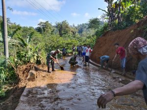Banjarnegara, Tops Berita – Pasca terjadinya bencana Tebing longsor, Babinsa Koramil 04/Karangkobar Serda Tohar dan Koptu Wahid bersama warga melaksanakan kegiatan karya bakti pembersihan longsoran tebing tepatnya di Rt 03/08 Desa Karangkobar, Kecamatan Karangkobar, Kabupaten Banjarnegara, Kamis (21/10/21).