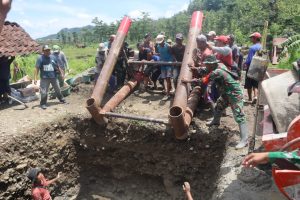 Brebes – Dandim 0713 Brebes, Korem 071 Wijayakusuma, Letkol Infanteri Sapto Broto, S.E., M.Si bersama Kepala DPU TARU Kabupaten Brebes Sutaryono, S,H., M.Si, Camat Tonjong dan Kepala KPKPH serta warga dan relawan melaksanakan Kerja Bakti Tangan Tuhan dengan melangsir material dan mengecor lubang untuk tiang pancang Jembatan Gantung diatas sungai Glagah Desa Kutamendala, yang nantinya akan menghubungkan dukuh Gardu ke dukuh Wadas Gumantung. Kemudian Dukuh Satir menuju Dukuh Wadas Gumantung, Desa Kutamendala, Kecamatan Tonjong, Brebes, Jawa Tengah. Minggu (11/02/2024).