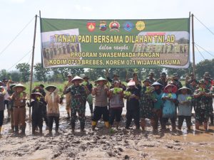 BREBES – Komandan Kodim (Dandim) 0713/Brebes Letkol Inf Sapto Broto, S.E., M.Si. ikut melaksanakan gerakan tanam padi di lahan TNI AD Desa Songgom Kecamatan Songgom Kabupaten Brebes. Gerakan tanam padi ini dalam rangka mendukung program swasembada pangan di wilayah Kabupaten Brebes.