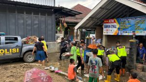 Dalam kegiatan itu, Polres Tegal turut mengerahkan Mobil Sabhara guna membantu proses pengangkutan lumpur, sampah, serta material sisa banjir dari lingkungan warga. Personel Polri bersama relawan dan masyarakat tampak bahu-membahu membersihkan rumah, kios, serta akses jalan agar aktivitas warga dapat segera kembali normal.