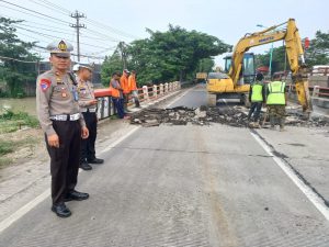 BREBES, Tops Berita – Perbaikan jembatan sungai gempol di jalur pantura Kecamatan Bulakamba Kabupaten Brebes hari ini mulai dilakukan. Satuan polisi lalulintas (satlantas) Polres Brebes memberlakukan rekayasa lalulintas di lokasi tersebut.