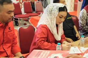 Kedatangan Paramitha berserta rombongan di kantor DPC PDIP diterima langsung ketua panitia pendaftaran bacabup Sukirso dengan jajarannya.
