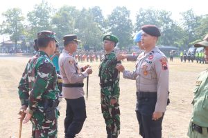 Kapolres Tegal AKBP Mochammad Zakun, S.H., S.I.K., dan Dandim 0712/Tegal Letkol Inf. Suratman S.IP., M.IP. selaku Pimpinan Apel dengan Komandan Apel Kasatsampta Polres Tegal AKP Surahno, S.H., M.H.