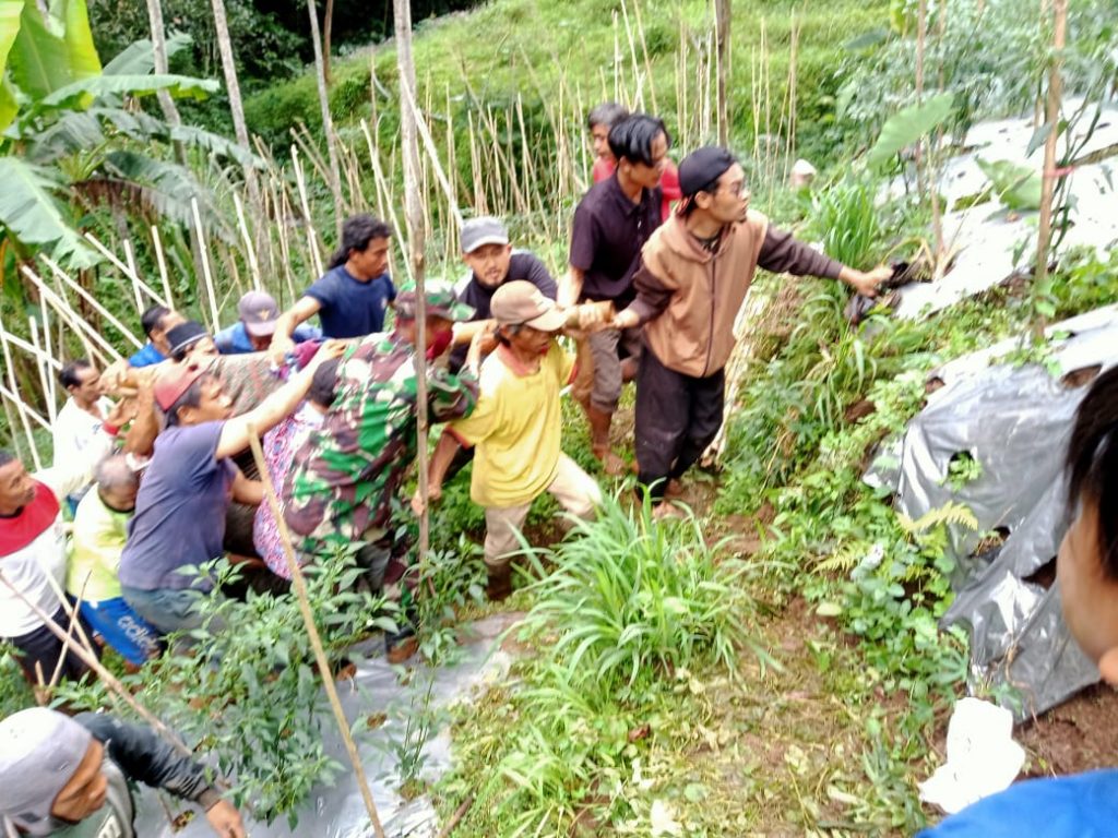 Topsberita. com. Tegal – Baninsa Koramil 19/Bumijawa Kodim 0712/Tegal membantu evakuasi korban longsor yang menimpa salah satu warganya, bertempat di Dukuh Mobok Suryani Rt 06/03 Desa Begawat Kec. Bumijawa. Minggu 13 Desember 2020. Tebing setingga 50 meter longsor menimpa salah satu warga atas nama Sariah (57) Rt 06/03 Dukuh Mobok Suryani Desa begawat Kec. Bumijawa yang sedang melaksanakan aktivitasnya memetik sayur mayur dikebunnya. Menurut keterangan dari Babinsa Koramil 19/Bumijawa Serda Deni Cipto Utomo, Sariah yang sehari-harinya beraktivitas bertani pergi ke kebun sekitar pukul 07.00 WIB pagi itu, Sariah memetik labu siam di kebun miliknya yang terletak dibawah tebing di Dukuh Mobok Suryani. Namun, sekitar pukul 08.00 tiba-tiba tebing setinggi 50 meter itu, longsor. Petani lainnya, Warso (35) yang saat kejadian sedang bekerja di kebun miliknya dan tidak jauh dari lokasi kejadian, mendengar suara gemuruh tebing longsor. Warso yang hanya terpisahkan oleh aliran sungai kecil, menengok ke sumber suara dan melihat longsoran menimpa Sariah yang berusaha lari dari gerakan tanah longsor tersebut. Melihat kejadian tersebut Warso langsung panik berlari minta tolong dan meminta bantuan kepada warga yang lain. sekitar pukul 09.30 WIB korban ditemukan dengan posisi bagian kaki di atas, dan seluruh badan tertimbun matrial longsor. Sementara Camat Bumijawa Susworo saat dikonfirmasi juga mengatakan, dia menuturkan bencana tanah longsor memang terjadi diwilayah Desa Begawat dan mengakibatkan satu orang korban meninggal dunia yang berprofesi sebagai petani. Kami minta warga selalu berhati-hati saat berada di area perbukitan, karena saat ini sedang musim hujan, tanah mudah longsor kapanpun. Nampak hadir dalam evakuasi tersebut warga masyarakat bersama Anggota Koramil 19/Bumijawa, Polsek Bumijawa, TRC Puskesmas Bumijawa dan BPBD ikut serta membantu evakuasi korban menuju ke rumah. (Nrs)