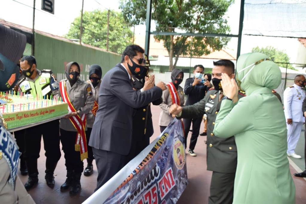 Tegal – Kapolres Tegal Kota AKBP Rita Wulandari Wibowo beserta rombongan menyambangi Kodim 0712/Tegal, Senin (5/10). Rombongan disambut oleh Dandim 0712/Tegal, Letkol Inf Sutan Pandapotan Siregar, S.I.P bersama Ketua Persit KCK Cabang XXII Kodim 071/Tegal, Ny. Ica Sutan Pandapotan Siregar. Kedatangan Kapolres untuk memberikan ucapan HUT Ke – 75 TNI Tahun 2020. Pada kesempatan itu Kapolres juga membawa tumpeng sebagai simbol rasa syukur akan kokoh dan tegaknya TNI. “Kapolres datang bersama anggotanya mengucapkan selamat HUT Ke – 75 TNI Tahun 2020 kepada kami” ucap Dandim. Lebih lanjut menurut Dandim bahwa ini juga isyarat akan kuatnya sinergi antara TNI dan Polri. “Seperti tema HUT Ke – 75 TNI, Sinergi Untuk Negeri,” katanya. “TNI, Polri dan Pemkot serta Pemda selalu bersinergi, terutama saat ini dalam menangani Covid-19,” pungkas Dandim. (TGH)