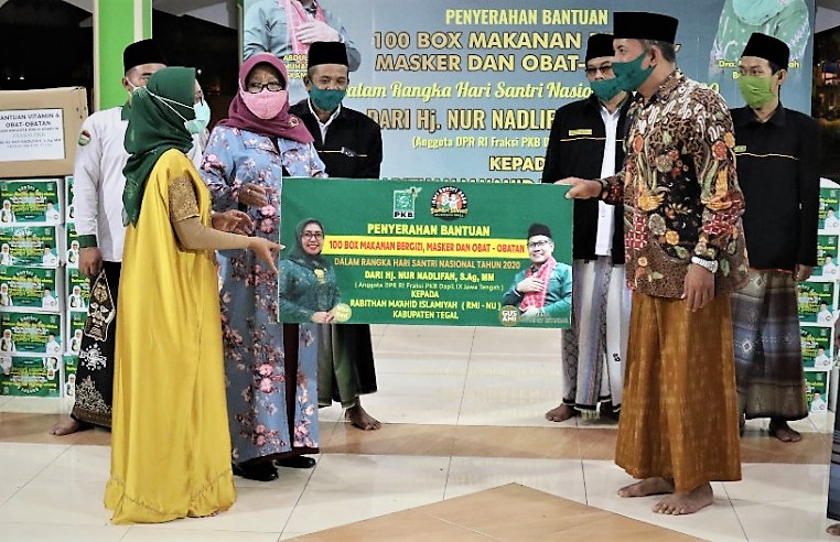 Slawi – Pemkab Tegal salurkan 100 dus berisi bahan makanan pokok, vitamin dan masker kepada sejumlah santri melalui organisasi Rabithah Ma’ahid Islamiyah (RMI) Kabupaten Tegal. Bantuan tersebut merupakan sumbangan dari anggota Dewan Perwakilan Rakyat Republik Indonesia (DPR RI) Komisi IX Nur Nadlifah pada momentum peringatan Hari Santri Nasional 2020. Bantuan tersebut diterima langsung Bupati Tegal Umi Azizah di rumah dinasnya, Kamis (22/10/2020) malam. Umi mengatakan, masa sulit akibat pandemi Covid-19 yang sudah berlangsung lebih tujuh bulan ini membawa dampak di berbagai sektor, termasuk di kalangan santri yang masih terus menuntut ilmu. Menurut Umi, tidak semua pondok pesantren (Ponpes) memiliki kemampuan yang sama dalam mencegah penularan Covid-19, termasuk peningkatan daya imun lewat asupan makanan dan minuman berigizi. “Saya rasa, pemberian bantuan pangan, masker dan vitamin ini sangat diperlukan untuk meningkatkan ketahanan pangan sekaligus daya imun, terutama mereka para santri dari keluarga tidak mampu. Dan momentum hari santri ini bisa menjadi sinyal penguat kepedulian kita pada kehidupan para santri sebagai penjaga nilai-nilai akidah umat Islam dan tradisi kebangsaan Indonesia. Adapun penyaluran bantuan ini kepada para santri, saya titipkan lewat kawan-kawan RMI Kabupaten Tegal,” kata Umi yang juga seorang santri lulusan Ponpes Mambaul Ma’arif, Denanyar, Jombang, Jawa Timur. Pada pertemuan yang berlangsung hangat tersebut, Umi sampaikan ucapan terima kasih kepada Nadlifah yang sudah membantu warga santri di masa pandemi Covid-19 ini. Mendapat respon positif dari orang nomor satu di Kabupaten Tegal tersebut, Nadlifah pun mengaku senang bisa membantu warga santri Kabupaten Tegal. Kepada pengasuh, pengurus dan perwakilan santri penerima, Nadlifah pun berpesan, agar selalu menjaga kesehatan dan menerapkan perilaku hidup bersih dan sehat di lingkungan Ponpes yang aman dari Covid-19. Menurutnya, pola pembelajaran dan kehidupan santri di lingkungan pondok yang tidak berjarak rentan terjadi penularan virus. Namun, dengan kedisiplinan yang tinggi dalam menerapkan protokol kesehatan dan menjaga interaksi dengan orang luar, lingkungan pondok justru menjadi lingkungan yang aman dari kontaminasi virus Covid-19 . “Sesuai dengan tema Hari Santri tahun ini, yaitu santri sehat Indonesia kuat, harapannya pondok pesantren bisa menjadi garda terdepan, contoh lingkungan pendidikan berbasis asrama yang mampu menerapkan standar minimal protokol kesehatan seperti penggunaan masker dan mencuci tangan dengan sabun serta menjaga jarak sebagai sebuah kebiasaan baru di kalangan santri,” ujar Nadlifah. Tak hanya memberikan bantuan pangan, anggota DPR RI dari Fraksi Partai Kebangkitan Bangsa tersebut juga memberikan bantuan 1.000 set alat rapid test untuk membantu tenaga kesehatan dalam melakukan skrining awal pada kelompok rentan hingga kontak erat kasus suspek dan terkonfirmasi Covid-19. Alat tersebut nantinya akan diserahkan kepada Satgas Penanganan Covid-19 Kabupaten Tegal. (Tgh)