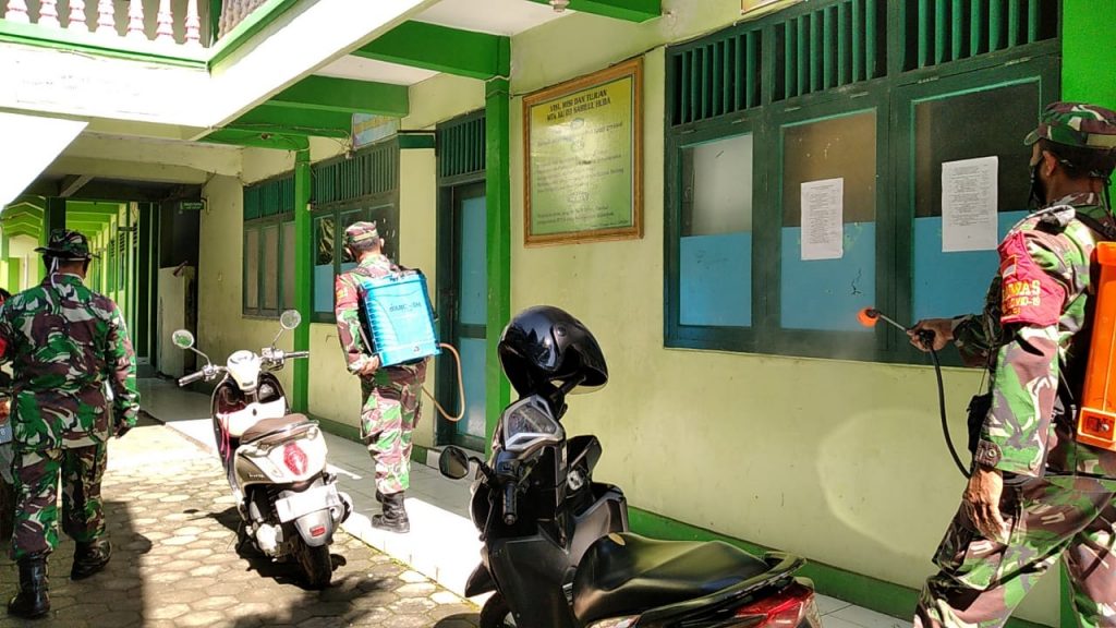 Top berita.com. Demak- Kodim 0716/Demak terus melakukan upaya penyemprotan disinfektan di lingkungan masyarakat untuk mencegah penyebaran Virus Covid-19 atau Corona. Dipimpin Danramil 03/Wonosalam Kapten Kav Karmadi bersama dengan FKPPI melaksanakan penyemprotan Desinfektan Di Pondok Pesantren Sabilul Huda yang beralamatkan di Desa Pilangrejo Kecamatan wonosalam Kabupaten Demak. Rabu 23/12/2020. Saat dikonfirmasi, Komandan Kodim 0716/Demak yang diwakili Danramil 03/Wonosalam Kapten Kav Karmadi mengatakan bahwa pihaknya telah melakukan penyemprotan di Ponpes Sabilul Huda. Dandim mengatakan, pihaknya akan terus memberikan pelayanan yang terbaik kepada masyarakat untuk mengantisipasi penyebaran virus Corona. Salah satunya dengan melakukan penyemprotan disinfektan kesejumlah fasilitas umum seperti sekolahan, pondok pesantren dan tempat-tempah ibadah lainnya. “Kami terud berupaya memberikan yang terbaik kepada masyarakat. Mari kita bersama-sama mencegah mulai dari menggunakan masker apabila keluar rumah, jaga jarak atau “physical distancing” dan selalu rutin cuci tangan dengan sabun,” ujar Dandim. Disisi lain, terkait penyemprotan disinfektan tersebut, Ky Haji Adlan Nur selaku pimpinan pondok pesantren menyambut baik. Pasalnya, penyemprotan tersebut dilakukan sebagai bentuk penanganan Corona yang sedang mewabah saat ini. Menurutnya, dengan adanya penyemprotan disinfektan ini diharapkan bisa mencegah penyebaran virus Corona khususnya di Pondok Pesantren Sabilul Huda. “Kami mewakili dari pondok pesantren Sabilul Huda mengucapkan terima kasih apresiasi atas penyemprotan disinfektan ini,” katanya. ( Tgh )