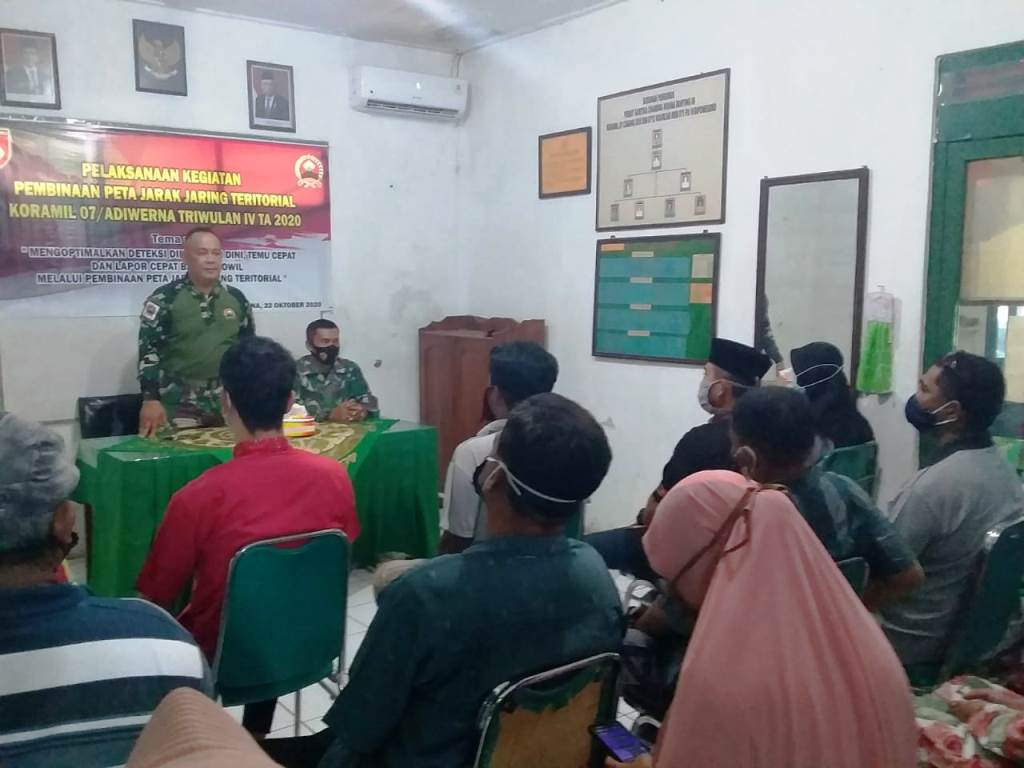 Adiwerna – Danramil 07/Adiwerna Kapten Arh Asep Koswara mengharapkan kepada seluruh mitra Koramil 07/Adiwerna dapat bersinergi, terutama agar dapat melaporkan hal – hal yang terjadi di wilayah masing – masing. Hal ini disampaikannya pada kegiatan Bin Peta Jarak Jaring Ter Koramil 07/Adiwerna, Minggu (8/11). Bin Peta Jarak Jaring Ter merupakan program kerja Koramil 07/Adiwerna bidang teritorial yang kali ini sudah memasuki Triwulan IV di tahun 2020, yang dilaksanakan guna mendukung tugas – tugas kewilayahan para Babinsa dan Danramil. Selanjutnya Danramil juga menyampaikan, akhir – akhir ini semua wilayah disibukkan dengan kegiatan penanganan Covid – 19, oleh karena itu Koramil mengharapkan bantuan untuk memberikan informasi terbaru terkait hal tersebut. “Kami mohon bantuan informasi terbaru terkait penangan Covid – 19 di wilayah masing – masing, sehingga Koramil setidaknya dapat membantu pengawasan bagi warga yang melaksanakan isolasi mandiri”, ujar Asep. “Terkait intensitas hujan yang mengalami peningkatan, bahkan kadang kala disertai angin kencang, saya juga minta informasikan kepada Babinsa kami apabila di wilayah terjadi bencana, agar segera bisa kami tindak lanjuti”, imbuhnya. “Mohon maaf juga apabila dalam kegiatan ini ada banyak kekurangan, karena keterbatasan kemampuan kami dalam penyelenggaraan”, pungkasnya. (Tgh)