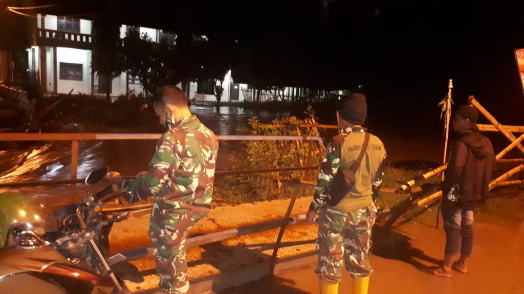 Tops berita.com. Tegal – Danramil Koramil 10/Dukuhturi Kapten Inf Radiyono bersama anggota Babinsa Koramil 10/Dukuhturi, Sertu Subekhi turun ke lokasi untuk memantau banjir tepatnya di Desa Dukuhturi dan Desa Kupu, Kecamatan Dukuhturi. “Saya ke lokasi setelah mendapat kabar dari masyarakat yang menyebutkan bahwa di Desa Dukuhturi dan Desa Kupu terendam banjir,” kata Sertu Subekhi, Jumat malam (01/01/21) pukul 18.30 WIB. Dia mengungkapkan, banjir yang terjadi di wilayah binaannya itu diakibatkan oleh luapan air Sungai Kemiri yang berada di sekitar rumah warga dan masuk kepemukiman warga sekitar tinggi 30 cm. Untuk itu, saya segera melaporkan kepada Danramil 10/Dukuhturi kejadian tersebut dan meminta kepada seluruh masyarakat agar tetap waspada dengan kejadian ini agar selalu siaga “Saya juga mengimbau kepada seluruh masyarakat agar berhati-hati dan waspada, apabila curah hujan semakin tinggi,” ungkapnya. sementara Danramil 10/Dukuhturi Kapten Inf Radiyono saat meninjau lokasi menyampaikan meminta kepada anggota Babinsanya untuk tetap memantau kejadian tersebut dan membantu masyarakat yang terdampak bencana banjir dari luapan air sungai Kemiri. Menurut data yang dikumpulkan oleh Danramil bersama anggota Polsek Dukuhturi, BPBD Kab. Tegal dan PMI Kab. Tegal saat ini yang sudah berada di lokasi antara lain Desa Dukuhturi yang terendam banjir akibat luapan sungai Kemiri adalah RW 03 : RT 01, RT 02, RT 03, RT 04 dengan ketinggian air 60 Cm dan Desa Kupu RW 01 : RT 07, 06, 05, 04, RW 02 : RT 07, 06, 05, RW 04 : RT 04, RT 02 dengan ketinggian air 30 Cm Menurut pantauan kami sejak pukul. 20.00 WIB Sampai dengan pukul 23.00 WIB kondisi air perlahan sudah mulai surut, petugas masih berjaga di lokasi dan selalu waspada. “Maka dari itu, saya mengimbau ke masyarakat agar selalu waspada bilamana hujan deras masih terjadi beberapa hari ke depan,” pesannya. (Nrs/tgh )