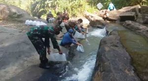 Tampak Babinsa Petahunan Koramil 15 Pekuncen Kodim 0701 Banyumas, Serka Eko Budi Wiyono, bersama Agus Mulyono Kesbang Kecamatan Pekuncen, Kades Petahunan Rohmat Fadli, dan juga Ketua Pokdarwis Curug Nangga Andiran Widianto, mendampingi pihak Diskanak Banyumas melakukan tebar bibit ikan tersebut.