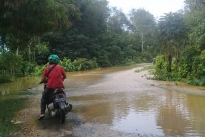 Intensitas hujan tinggi yang berkepanjangan mengakibatkan air sungai subayang meluap kepermukaan jalan. Debet air yang datang tak mampu dibendung sungai subayang.