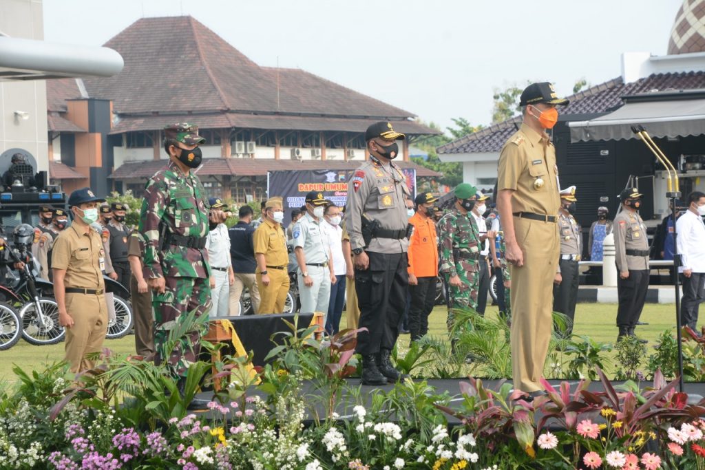 Tops berita.com. Semarang-Dalam rangka mendukung terwujudnya kondusifitas wilayah Jawa Tengah yang aman, nyaman dan damai, Kodam IV/Diponegoro bersama Polda Jateng dan Pemerintah Provinsi Jateng melakukan apel gelar pasukan Operasi Lilin Candi 2020, di halaman Mapolda Jateng Jl. Pahlawan No. 1 Kota Semarang, Senin (21/12). Apel gelar pasukan yang dihadiri Pangdam IV/Diponegoro Mayjen TNI Bakti Agus Fadjari, S.I.P., M.Si. ini dilaksanakan dalam rangka pengecekan personel, sarana dan prasarana untuk pengamanan Natal dan tahun baru 2021 di wilayah provinsi Jawa Tengah. Selain TNI dan Polri peserta yang terlibat diataranya adalah Basarnas, Satpol PP, BPBD dan Dinas Perhubungan Provinsi Jawa Tengah. Kapendam IV/Diponegoro Kolonel Kav Susanto, S.I.P., M.Si. mengungkapkan bahwa Kodam IV/Diponegoro siap diterjunkan untuk membantu kepolisian dalam mengamankan perayaan Natal 2020 dan Tahun Baru 2021 di tengah situasi Pandemi Covid 19. Bahkan Kodam IV/Diponegoro telah menyiapkan sejumlah prajurit di seluruh wilayah untuk siap siaga di tengah kondisi cuaca ekstrim seperti ini untuk mendukung BPBD menghadapi potensi kerawanan terkait bencana alam. “Berbeda dengan tahun lalu, kali ini kita harus bersama-sama, kompak untuk disiplin protokol kesehatan serta selalu waspada menghadapi cuaca ekstrim yang terjadi di semua wilayah Jawa Tengah.” ungkapnya. Masyarakat dihimbau tetap ditempat masing masing, namun apabila terpaksa berpergian agar mengikuti prokes yang telah ditetapkan oleh satgas Covid 19 Sesuai SE Satgas Covid 19 Nomor 3 Tahun 2020 tentang Protokol kesehatan perjalanan orang selama libur Hari Raya Natal dan menyambut Tahun Baru 2021. “Mari semuanya kita bisa menahan diri untuk tidak berkumpul di luar rumah selama masa pandemi virus corona. Hal ini penting demi menekan laju penyebaran dan penularan.” pungkasnya. Hadir dalam kegiatan tersebut Gubernur Jawa Tengah Ganjar Pranowo, Wakapolda Jateng Brigjen Pol Abiyoso Seno Aji, Kajati Prov Jateng, KA Kesbangpol Jateng, Danlanal Semarang, Danlanumad Semarang, Kadinhub Jateng, Kasatpol PP Jateng, Kepala Basarnas Jateng, Kepala BPBD Jateng dan GM PT Jasa Marga Cab. Semarang. ( Tgh )