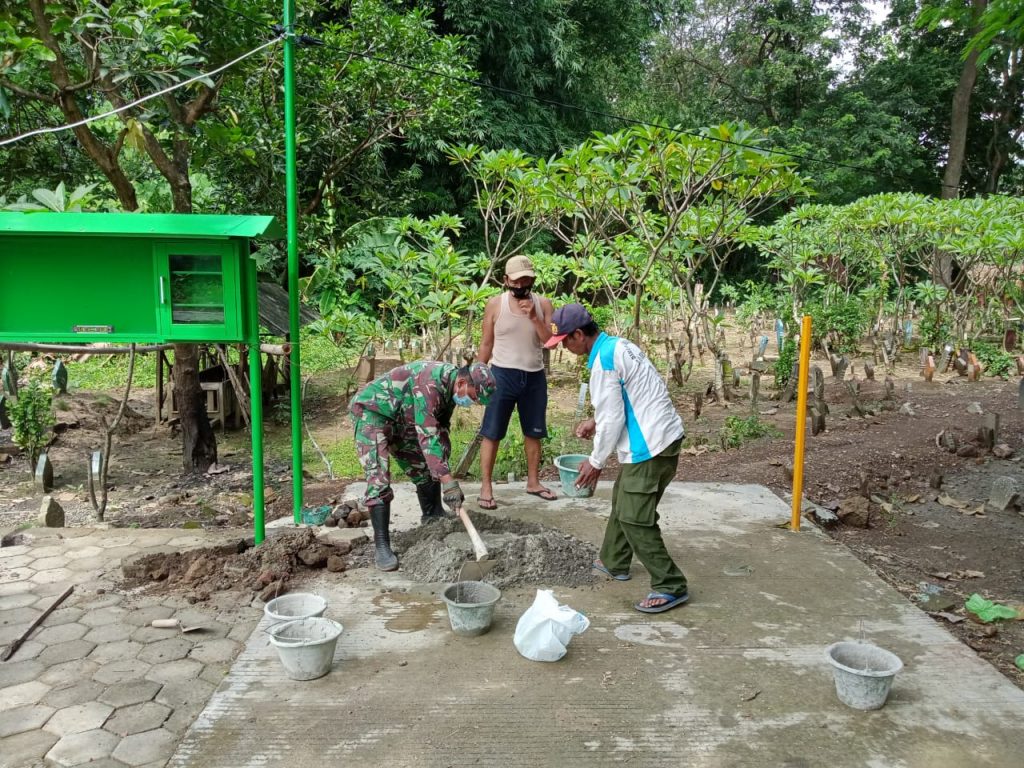 Topsberita.com. Demak- Bintara Pembina Desa (Babinsa) Koramil 12/Mranggen Kodim 0716/Demak Sertu M.Istiyadi bersama dengan warga melaksanakan karya bakti gotong-royong pemasangan paving jalan menuju makam di Desa Brumbung Rt 01 Rw 04 Kecamatan Mranggen Kabupaten Demak. Selain pemasangan paving, dalam kegiatan karya bhakti tersebut juga dilaksanakan pembuatan papan informasi dan pembuatan almari tempat menyimpan buku yasin diarea makam. Senin 28/12/2020. Saat di lokasi, terlihat jelas kekompakan gotong-royong saling bantu-membantu antara Babinsa Brumbung bersama dengan warga setempat dalam pemasangan paving jalan.“Kami Babinsa ikut terjun langsung ke lapangan bersama warga untuk gotong-royong pemasangan paving blok ini. Diharapkan pengerjaan paving jalan ini cepat selesai dan dapat digunakan warga pada saat ke makam apalagi saat ini sudah masuk musim penghujan. Ucap Sertu Istiyadi. Sertu Istiyadi mengatakan, kegiatan karya bakti pemasangan paving jalan ini selain untuk mempererat tali silaturahmi antara TNI dengan masyarakat khususnya anggota Koramil 12/Mranggen dan masyarakat Desa Brumbung juga bertujuan untuk menumbuhkembangkan hidup gotong – royong di masyarakat. “Melihat para warga yang sedang bekerja tanpa di mintai bantuanpun kami selaku babinsa siap membantu, itu memang sudah menjadi kewajiban kami untuk mengatasi kesulitan rakyat sekelilingnya, salah satunya adalah yang sekarang kami lakukan sekarang ini yaitu membantu warga Desa Brumbung memasang paving jalan di area makam.” ungkapnya. ( Tgh )