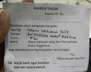 Dalam undangan tertera tulisan Rapat Bantuan Uang Dari Perusahaan Putra Nusantara, juga tulisan : Wajib Hadir Agar Bantuan Bisa Cair Secara Utuh