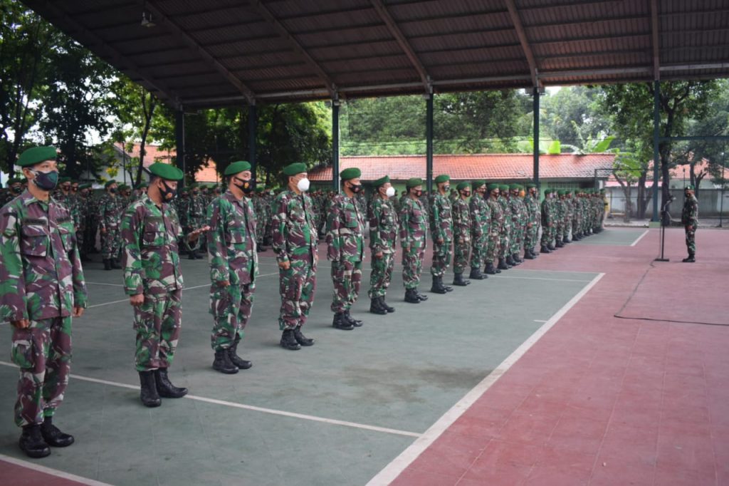 Tops berita.com. Palakhar Kepala Sataf Kodim (Kasdim) 0712/Tegal, Kapten Arh Asep Koswara pimpin kegiatan Apel Pagi gabungan Anggota Makodim 0712/Tegal dengan Koramil jajaran Kodim 0712/Tegal, bertempat di Indoor Lapangan Tenis Makodim 0712/Tegal, Senin (18/01/21). Dalam arahannya Plh.Kasdim 0712/Tegal mengatakan, “Pertama – tama marilah kita panjatkan puji syukur kehadirat Allah SWT karena sampai saat ini kita masih di beri kesehatan dan keselamatan sehingga bisa melaksanakan apel pagi ini.” Kasdim juga menambahkan, kepada seluruh anggota baik Makodim maupun anggota Koramil jajaran Kodim 0712/Tegal agar senantiasa menjaga kesehatan baik diri sendiri maupun keluarga didalam pandemi Covid-19 yang selama ini masih menghantui kita. Adapun penekanan-penekanan yang disampaikan meliputi, agar segera membaharui data wilayah untuk diseragamkan dan disamakan oleh Kodim 0712/Tegal, memasuki musim penghujan ini para babinsa jajaran Kodim segera laksanakan temu cepat dan lapor cepat kepada Danramil masing-masing wilayah untuk dilaporkan ke satuan atas, bagi para babinsa jajran Kodim 0712/Tegal agar selalu siap dalam membantu pemerintahan daerah seperti Pelaksanaan kegiatan Vaksin Bagi Nakes Di Wilayah Masing-masing. (Pendimtegal/tgh)