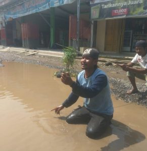 Dalam aksi tersebut salah satu warga melakukan tangkap ikan (gogoh) juga dengan alat kail disamping itu ada pohon pisang yang tertanam di tengah tengah jalan raya ini. jumat, (04/02/2022).