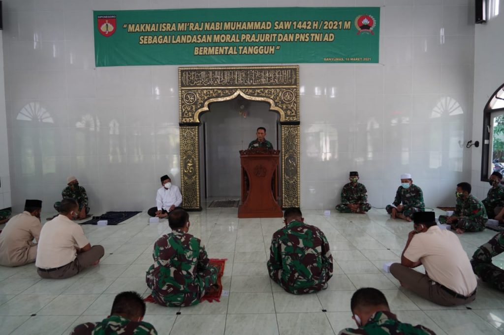Peringatan Isra Mi’raj Nabi Besar Muhammad SAW mengambil tema” Maknai Isra Mi’raj Nabi Muhammad S.A.W 1442 H/2021 M Sebagai Landasan Moral Prajurit dan PNS TNI AD Bermental Tangguh” ini, selaku penceramah Ketua MUI Banyumas Bapak KH. Drs. Taefur Arofat, M.Pd.I.