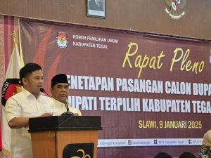 Tegal– Topsberita. com – Komisi Pemilihan Umum (KPU) Kabupaten Tegal menggelar Rapat Pleno Penetapan Pasangan Calon Bupati dan Wakil Bupati Terpilih 2024 di Syailendra Convention Hall Hotel Grand Dian Slawi. Kamis, (9/1/2025).