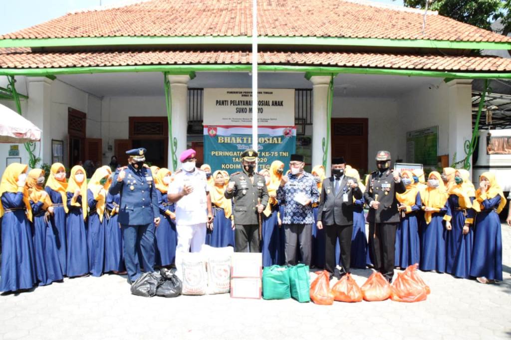 Tegal-Rangkaian kegiatan dalam menyambut HUT TNI ke 75 tahun 2020, Kodim 0712/Tegal melaksanakan bakti sosial ke panti pelayanan sosial anak “Suko Mulyo” Kelurahan Pekauman Kecamatan Tegal Barat Kota Tegal, Jumat (2/10/2020). Turut dalam kegiatan itu antara lain Dandim 0712/Tegal, Letkol Inf Sutan Pandapotan Siregar, S.I.P, Danlanal Tegal Letkol Mar Ridwan Azis, M.Tr. Hanla, CHRMP, Kapolres Tegal Kota AKBP Rita Wulandari Wibowo, S.IK, MH, Kapolres Tegal Kota AKBP Rita Wulandari Wibowo, S.IK, MH, Dansatradar 214/Tegal Letkol Udara Lek Priyambodo Satriyo dan Wakil Walikota Tegal M. Jumadi, ST, MM. Kedatangan rombongan Dandim disambut oleh kepala Panti Asuhan, Sudarman. Protokol kesehatan tetap diperhatikan dalam acara tersebut. “Kami bersama Forkopimda, TNI AL dan TNI AU datang ke panti asuhan ini sebagai rangkaian kegiatan menyambut HUT TNI ke 75 tahun 2020,” ucap Dandim. Pada kesempatan itu, Dandim beserta rombongan memberikan bantuan sembako. “Semoga bantuan Sembako ini bermanfaat bagi panti pelayanan sosial anak “Suko Mulyo” ini,” pungkas Dandim. (TGH )
