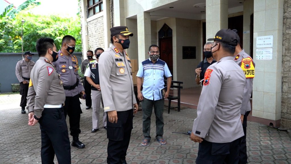 Kapolres Batang Pastikan Keamanan Jelang Natal dan Tahun Baru Pastikan Keamanan Jelang Nataru, Kapolres Batang Pimpin Keliling Gereja dan Pos Pengamanan Batang-Untuk memastikan keamanan jelang Natal dan Tahun Baru 2021, Jajaran Kepolisian Resor (Polres) Batang berkeliling gereja di pusat Kabupaten Batang. Kapolres Batang AKBP Edwin Louis Sengka memimpin langsung pengecekan sejumlah gereja dan pos pengamanan di Batang. “Kami mengecek kondisi gereja jelang natal, juga mengecek pengamanan karena tiap gereja dijaga anggota kami,” kata Kapolres Batang AKBP Edwin Louis Sengka di Gereja Katolik Santo Yusup Batang Jl Jenderal Sudirman no 218, Selasa (22/12/2020). Ia mengatakan di Kabupaten Batang ada 22 gereja yang dijaga aparat keamanan. Seluruh gereja di Kabupaten Batang tidak mengadakaan ibadah natal tatap muka. “Saya pastikan seluruh gereja melakukan ibadah secara online,” tegasnya. Pimpinan Gereja Santo Yusup, Romo Yoseph mengatakan awalnya ingin melaksanakan ibadah Natal secara offline. Namun, melihat perkembangan COVID-19, pihak gereja dan jemaatnya sepakat gelar ibadah secara online. “Hal itu sudah kami sampaikan ke seluruh umat,” katanya. Romo Yoseph menerangkan, Natal tahun ini selain menggelar ibadah Liturgis Gerejani, tetapi lebih menekankan bakti sosial kepada umat dan masyarakat yang termasuk ekonomi lemah, dengan membagikan sembako. ( Tgh)