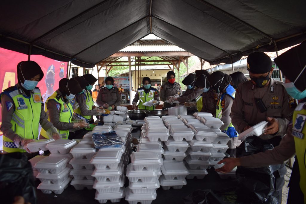 TopsBerita. com. Demak – Pandemi Covid-19 ini menimbulkan dampak yang sangat besar bagi masyarakat menengah ke bawah. Sebagai bentuk kepedulian dan mengamankan jaring pengaman sosial, jajaran Polres Demak dan Kodim 0716/Demak bersama-sama mendirikan dapur umum dan bhakti sosial. Sebagai wujud nyata dalam membantu masyarakat kecil terdampak Covid-19, sebanyak 20 Polwan Polres Demak di terjunkan untuk memasak bersama TNI dari Kodim 0716/Demak di dapur umum yang didirikan di halaman Mapolsek Sayung, Selasa (15/12/2020). Kapolres Demak AKBP Andhika Bayu Adittama mengatakan, dapur umum tersebut didirikan sebagai upaya dari TNI dan Polri untuk menghadirkan jaring pengaman sosial bagi masyarakat. Selain itu, lagkah ini dilakukan sebagai tindak lanjut arahan dari Kapolda Jateng agar mendayagunakan seluruh kekuatan dan upaya dalam penanganan pencegahan penyebaran Covid-19 baik di bidang kesehatan maupun dampak sosial dan ekonomi yang menerpa masyarakat. “Kami berharap dengan dapur umum yang didirikan ini dapat membantu memenuhi kebutuhan makan masyarakat terdampak corona” kata Kapolres. Sementara itu, salah satu Polwan pelaksana dapur umum, Iptu Aminah menuturkan, bahwa dapur umum itu akan dilaksanakan seminggu sekali dengan menyiapkan 600 bungkus makanan untuk masyarakat terdampak corona di wilayah Kabupaten Demak. “Dapur umum ini dilaksanakan oleh Polwan dan personel Polres Demak yang bekerjasama dengan TNI. Setiap minggunya di Kecamatan berbeda akan disiapkan 600 bungkus nasi yang akan di bagikan kepada masyarakat. Semoga yang kami lakukan ini dapat membantu meringankan beban masyarakat” pungkasnya (Tgh )