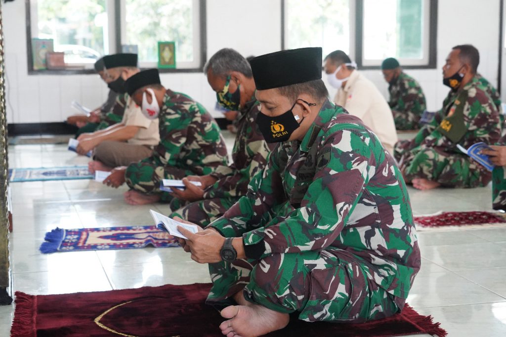 Tops Berita.com * Banyumas – Lantunan Surat Yasin, Tahlil dan Doa menggema di Masjid Wijayakusuma Makorem 071/Wijayakusuma. Lantunan ayat-ayat Allah SWT tersebut disenandungkan para Prajurit dan PNS Makorem 071/Wijayakusuma dan Balak Aju Kodam IV/Diponegoro jajaran Korem 071/Wijayakusuma yang berada dalam satu lingkungan dengan Makorem 071/Wijayakusuma dalam rangka Doa Bersama Hari Juang TNI AD Korem 071/Wijayakusuma, Selasa (15/12/2020) di Masjid Wijayakusuma Makorem 071/Wijayakusuma, Sokaraja, Banyumas. Doa bersama dilaksanakan usai Sholat Dhuhur berjamaah dan dilakukan *dengan tetap menerapkan Protokol Kesehatan* dimasa pandemi Covid-19 ini dipimpin Ustadz Sertu Dzamzam Nuryanto (Bintalrem 071/Wijayakusuma), dihadiri Danrem 071/Wijayakusuma Kolonel Inf Dwi Lagan Safrudin, S.I.P., Kasrem 071/Wijayakusuma Letkol Kav Kristiyanto, S.Sos., para Kasirem dan Kabalak Aju Kodam IV/Diponegoro jajaran Korem 071/Wijayakusuma serta prajurit dan PNS baik Makorem 071/Wijayakusuma maupun Balak Aju Kodam IV/Diponegoro jajaran Korem 071/Wijayakusuma. Danrem 071/Wijayakusuma Kolonel Inf Dwi Lagan Safrudin, S.I.P., menyampaikan kegiatan doa bersama ini sebagai wujud rasa syukur kepada Allah SWT atas limpahan rahmat, berkah dan lindungan-Nya karena sampai detik ini diberikan anugerah yang tak terhingga kepada kita untuk menjalankan tugas sebagai prajurit dan PNS TNI AD mengabdi kepada bangsa dan negara dengan baik. “Doa bersama ini juga dilaksanakan agar TNI AD tetap kokoh dalam mengemban tugas menjaga keutuhan dan kedaulatan NKRI. Menjaga keselamatan bangsa dan negara serta mempersatukan seluruh komponen dan elemen bangsa untuk tetap tegak kokohnya NKRI”, ungkapnya. Diharapkan dengan doa bersama ini, lanjutnya. Dapat menumbuhkan rasa nasionalisme dan patriotisme yang tinggi sebagai prajurit TNI khususnya TNI AD prajurit dan PNS Korem 071/Wijayakusuma beserta Balak Aju Kodam IV/Diponegoro jajaran Korem 071/Wijayakusuma. “Momentum doa bersama peringatan Hari Juang TNI AD kali ini, sebagai wahana instrospeksi kita prajurit dan PNS tentang apa yang sudah dilaksanakan untuk mematangkan diri, memajukan dan meningkatkan profesionalitas prajurit dan PNS dalam melaksanakan tugas mengabdi pada bangsa dan negara”, imbuhnya. Selain itu, momentum ini untuk merefleksikan dalam rangka meningkatkan kualitas dan perannya sebagai unsur pertahanan negara demi kepentingan masyarakat, bangsa dan negara. “Melalui kegiatan ini pula kita perlu sampaikan bahwa prestasi yang telah dicapai TNI AD hingga saat ini tentu tidak terlepas dari kerja keras para pendahulu yang telah mengabdikan jiwa raganya dan dedikasi serta perjuangan dan pengorbanannya demi kemajuan TNI AD. Oleh karenanya, mari kita mantapkan langkah menuju kemanunggalan TNI bersama Rakyat, TNI AD yang maju, modern, berani, tulus dan ikhlas serta semangat dalam menjalankan tugas kita sebagai prajurit. Dengan berpegang teguh Sapta Marga, Sumpah Prajurit dan Delapan Wajib TNI”, pungkasnya. ( Tgh )