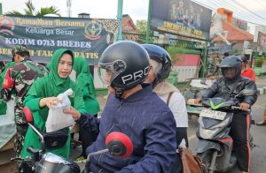 Brebes – Ramadhan bersama keluarga besar Kodim 0713 Brebes dan memperingati Hari Ulang Tahun (HUT) Persit Kartika Chandra Kirana (KCK) yang ke-78, Ketua Persit Kartika Chandra Kirana (KCK) Cabang XXIII Dim 0713 Korcab Rem 071 PD IV/Diponegoro Ny. dr. Novi Sapto, Sp.M beserta anggota, menggelar kegiatan bagi-bagi takjil kepada warga masyarakat kabupaten Brebes. Kegiatan tersebut dilakukan di depan Makodim Brebes, Jalan Jenderal Soedirman 107 Brebes, Jawa Tengah. Jum’at (29/03/2024).