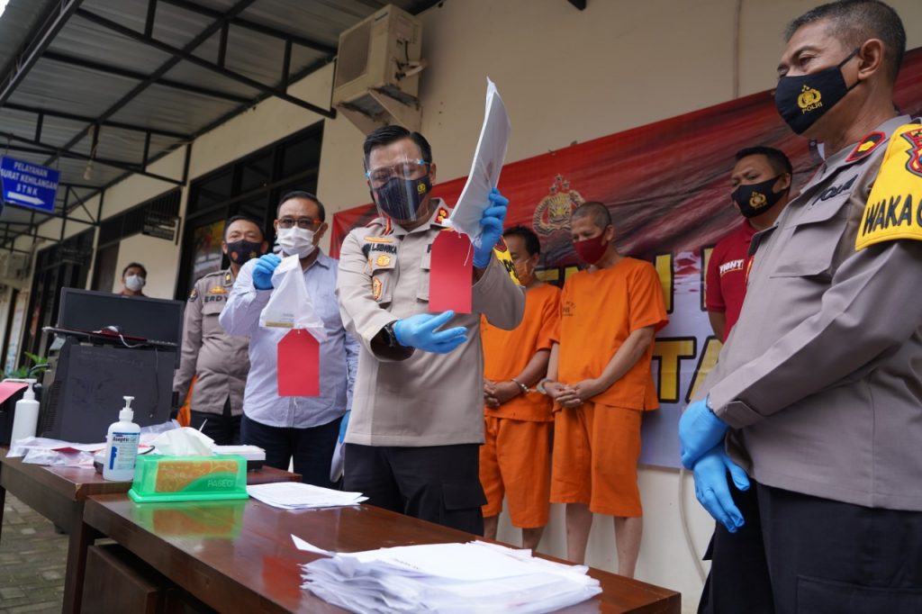 Tops berita.com. Batang – Satreskrim Polres Batang berhasil mengungkap kasus tindak pidana penipuan atau penggelapan uang pengurusan pemecahan sertifikat yang membuat korban, Uriyah (40) warga Gringsing mengalami kerugian Rp422 juta. Kapolres Batang AKBP Edwin Louis Sengka mengatakan perkara penipuan dan penggelapan itu terjadi dalam kurun waktu tahun 2019 hingga 5 Desember 2020. Ada dua tersangka dalam kasus itu yaitu S (51) Warga dukuh Sabetan Kidul desa Mororejo Kaliwungu kendal sebagai pelaku utama dan AM (51) warga kelurahan Medono Kota Pekalongan. “Dengan rangkaian perkataan bohong dan tipu muslihatnya tersangka menawarkan jasa pemecahan sertifikat pada Uriyah dengan dalih dekat petugas Badan Pertanahan Nasional (BPN) Batang,” kata Kapolres Batang AKBP Edwin Louis Sengka saat konferensi pers, Rabu (30/12/2020). Ia mengaku sanggup untuk melakukan pemecahan sertifikat lahan kavling milik korban, yang sebelumnya merupakan lahan pertanian diubah menjadi lahan darat. Karena bujukan tersangka itu, akhirnya korban mau menerima bantuan yang ditawarkan S untuk pemecahan sertifikat hak milik (splitsing) atas tanah hak milik nomor 01563 atas nama Machfud (Suami korban). Seiring berjalanannya waktu, S beberapa kali meminta sejumlah uang kepada korban dengan alasan untuk biaya proses pendaratan dan splitsing, bahwa sebenarnya proses yang dijanjikan S tidak dilakukanya. Penyerahan uang secara bertahap untuk kepentingan itu semua hingga berjumlah Rp422 juta. Untuk menyakinkan korban, S menunjukkan sertifikat hasil pemecahan yang seolah-olah diterbitkan oleh BPN. Ternyata, setelah korban melakukan kroscek ke BPN, ternyata tidak ada sertifikat yang dimaksud. “Surat dan dokumen palsu itu dibuat oleh AM warga kota Pekalongan,” jelasnya. Uriyah dan suaminya pun langsung melaporkan kejadian itu ke Polres Batang. Barang bukti yang berhasil diamankan di antaranya 20 lembar kwitansi pembayaran uang, 1 bendel rekening koran milik tersangka, 1 bendel sertifikat dan dokumen palsu, 1 buah printer, 1 buah layar monitor, 1 buah hardisk, 1 buah keybord, 1 buah mouse, 1 buah alat latminating, pisau pemotong, benang, stempel, kertas warna, buku rekening bank, kartu ATM dan 9 bendel sertifikat tanah palsu Akibat perbuatannya itu, kedua tersangka dijerat pasal 378 dan atau Pasal 372 KUHPidana dengan ancaman hukuman maksimal lima tahun penjara ( tgh )