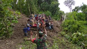 Brebes – TNI Koramil 09 Tonjong bersama Kades Kutamendala H. Faturi, S.Ag beserta perangkat desa, Relawan Brebes selatan diantaranya Relawan Mapala Sakti Paguyangan, Relawan Sapoe Bumi Kutamendala, Relawan BPBD Kabupaten Brebes Selatan dan Relawan dari Sirampog serta warga masyarakat Desa Kutamendala melaksanakan Gerakan Tangan Tuhan Menuju Brebes Berhias dengan Tulus dan Ikhlas, yakni bergotong royong mengangkat dan memindahkan tiang pancang jembatan gantung dan material lainnya dari dukuh Satir menuju dukuh Wadas Gumantung. Rabu (07/02/2024).
