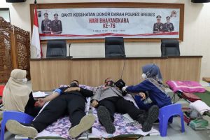 Kegiatan Bhakti Sosial donor darah dalam rangka sambut Hari Bhayangkara ke 76 Polres Brebes mengambil tema ”Polri Yang Presisi Mendukung Pemulihan Ekonomi Dan Reformasi Struktural Untuk Mewujudkan Indonesia Tangguh Indonesia Tumbuh”.