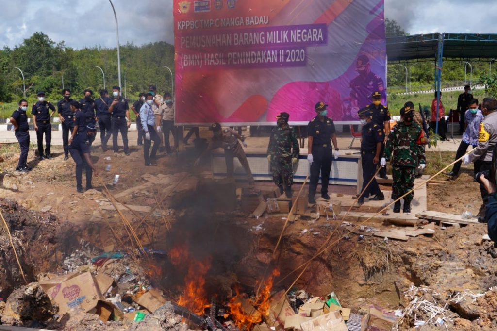 Satgas Pamtas RI-MLY Yonif 407/PK Bersama Instansi Terkait Musnahkan Barang Milik Negara Hasil Penindakan Satgas Pamtas Yonif 407/Padmakusuma bersama Kantor Pengawasan dan Pelayanan Bea dan Cukai Tipe Madya Pabean C Nanga Badau serta instansi terkait melakukan pemusnahan barang milik negara hasil penindakan pada kantor Pengawasan dan Pelayanan Tipe Madya Pabean C Nanga Badau (KPPBC TMP C Nanga Badau). Adapun barang-barang yang dimusnahkan itu berupa 1.702.440 batang Barang Kena Cukai Hasil Tembakau Sigaret Kretek Mesin (BKC HT SKM), 3.304 botol/kaleng Minuman Mengandung Etil Alkohol (MMEA) berbagai merk, 911 pcs pakaian bekas, 1 unit mesin AC bekas dan 1 unit gergaji mesin bekas. Perkiraan nilai barang yang dimusnahkan adalah sebesar Rp. 1.646.371.600,00 (satu milyar enam ratus empat puluh enam juta tiga ratus tujuh puluh satu ribu enam ratus rupiah). Pemusnahan dilakukan dengan cara dibakar, dirusak dan ditimbun di area PLBN Badau oleh Kepala KPPBC TMP C Nanga Badau bersama instansi terkait. Barang-barang yang dimusnahkan merupakan barang hasil penindakan operasi kepabeanan dan cukai (Operasi Gempur Rokok llegal, Operasi Pasar, Operasi Bersama di Zona Netral, pencegahan Pelintas Batas di Pos Lintas Batas Badau) KPPBC TMP C Nanga Badau periode Juli 2019 – Oktober 2020 di berbagai wilayah pengawasan Bea dan Cukai Nanga Badau dan hasil penyerahan dari Satgas Pantas Yonif 407/Padmakusuma, hal ini untuk menjalankan fungsi bea dan cukai sebagai community protector yaitu melindungi masyarakat dari barang barang yg terlarang dan ilegal. Dansatgas Pamtas RI-MLY Letkol Inf Catur Irawan mengatakan, Pemusnahan tersebut dilakukan untuk menghilangkan sifat dan fungsi awal barang sehingga tidak lagi memiliki nilai ekonomis sesuai dengan surat persetujuan pemusnahan BMN yang diterbitkan Kepala Kantor Wilayah DJKN Kalimantan Barat dan Kepala Kantor Pelayanan Kekayaan Negara dan Lelang (KPKNL) Pontianak. Selain menimbulkan potensi kerugian negara juga dapat mengganggu industri tekstil/garment dalam negeri karena dapat mengganggu stabilitas pasar tekstil/garment dalam negeri. Kerugian inmateriil yang tidak terhitung lainnya adalah bahaya dari sisi kesehatan pakaian bekas yang berpotensi sebagai pembawa virus atau bakteri yang bisa menimbulkan penyakit. “Kami juga menghimbau kepada masyarakat agar taat dan patuh kepada aturan yang berlaku karena di perbatasan seperti Badau ini sangat rentan terhadap pemasukan atau pengeluaran tidak langsung barang illegal yang bisa memberi dampak kerugian bagi masyarakat baik langsung maupun tidak langsung” ucap Dansatgas. Kepala Kantor Pengawasan dan Pelayanan Bea dan Cukai Tipe Madya Pabean C Nanga Badau, Bapak Wijang Abdillah mengucapkan terimakasih dan penghargaan yang setinggi tingginya atas peran serta masyarakat dan sinergi dari aparat penegak hukum serta dari unsur CIQS yg telah senantiasa berkomitmen untuk menjaga perbatasan dan melindungi masyarakat indonesia dan penyelundupan dan perdagangan ilegal. Semoga kedepan sinergisitas dapat lebih baik lagi. Hadir dalam acara tersebut Camat Badau, Komandan Batalyon Yonif 407/Padmakusuma, Kapolsek Badau, Imigrasi dan Karantina, Administrator PLBN dan tokoh adat dan tokoh masyarkat setempat. ( Tgh )