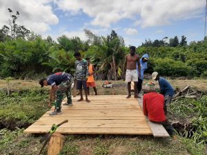 Papua Barat – Topsberita.com – Pentingnya jembatan buat akses jalan masyarakat di wilayah binaan, Satgas PAMTAS Kewilayahan Yonif 407/PK mengerahkan prajuritnya dari Pos Kamundan untuk membantu warga binaanya membangun jembatan di Kampung Bibiram Distrik Kamundan Kabupaten Teluk Bintuni, Papua Barat, Kamis (28/9/2023).