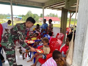 Papua Barat – Topsberita.com – Untuk meningkatkan kualitas imunisasi kesehatan kepada anak Balita yang berada di perbatasan, Pos Dataran Beimas, Satgas Pamtas Yonif 407/PK bekerja sama dengan Puskesmas Dataran Beimas membagikan susu dan makanan menambah kesehatan, dan Pembagian Snack di Kampung Sirr, Distrik Dataran Beimas, Kabupaten Teluk Bintuni, Papua Barat.