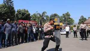 Tegal – Topsberita. com – Kapolres Tegal AKBP Mochammad Sajarod Zakun SH SIK melalui Kabagops Kompol Sardoyo, S.H., M.H. kembali menggelar Simulasi Pelatihan Dalmas Lanjutan Penanganan Situasi Chaos Tahapan Pemilu Polres Tegal pada Senin, 25 September 2023 di halaman mako Polres Tegal pukul 08.00 s.d. 12.00 WIB