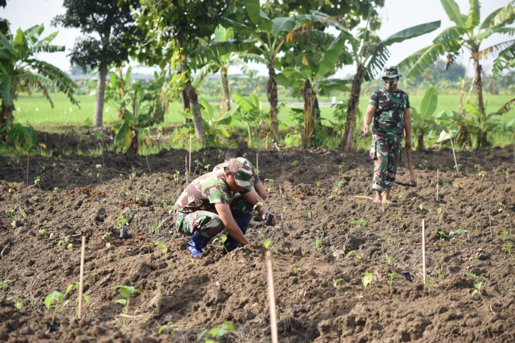 Tops berita.com. Demak – Dalam rangka mendukung progam ketahanan pangan Nasional, Kodim 0716/Demak melalui Koramil 09/Karangtengah melaksanakan penanaman pohon pepaya, cabai, dan ketimun di Desa Karangsari, Kecamatan Karangtengah, Rabu (13/01/2021). Ada 500 bibit pepaya jenis california, 500 bibit cabai yang ditanam Danramil beserta anggotanya di lahan yang berada tepat di belakang Puskesmas Karangtengah, seluas kurang lebih 1 Hektar ini. Danramil Kapten Inf Mulyadi mengatakan, pihaknya sudah mempersiapkan lahan tanam pepaya California dengan baik. Dimana lahan ini sudah bersih dari gulma dan sisa-sisa tanaman lainnya. Sudah diolah dan diratakan serta dicampur dengan abu bekas bakaran sawmill. Lubang tanam sudah disiapkan sebelumnya agar mengurangi kemasaman dan kandungan air. Lubang tanam dibuat dengan ukuran 20 x 20 x 15 cm, jarak lubang juga disesuaikan dengan jarak tanam 1,5 x 1,5 meter. “Atas instruksi dari pak Dandim, kita sudah perhitungkan dengan matang untuk persiapan dan pengolahan lahan tanam agar pertumbuhan tanaman nantinya tidak terganggu,” ungkapnya. Terpisah, Komandan Kodim 0716/Demak Letkol Arh Mohamad Ufiz, S.I.P, M.I.Pol menjelaskan bahwa dalam mendukung ketahanan pangan, ia sengaja memilih pepaya California dengan beberapa alasan. Salah satunya, tanaman pepaya varietas California merupakan salah satu jenis pepaya yang sedang digandrungi masyarakat pada saat ini, karena memiliki sifat dan keunggulan tersendiri yaitu buahnya tidak terlalu besar dengan bobot 0,8 – 1,5 kg/buah, berkulit hijau tebal dan mulus, berbentuk lonjong, buah matang berwarna kuning, rasanya manis, daging buah kenyal dan tebal. Selain itu, varietas ini termasuk jenis unggul dan berumur genjah, pohon/batangnya antique kerdil/lebih pendek dibanding jenis pepaya lain, tinggi tanaman sekitar 1,5 – 2 meter dan sudah bisa dipanen setelah berumur 8 – 9 bulan. “Pohonnya dapat berbuah hingga umur mencapai empat tahun. Dalam satu bulan bisa dipanen sampai empat kali. Sekali panen setiap pohon dapat menghasilkan 2 hingga 3 buah dengan sekali panen setiap minggu bisa mencapai berkisar 1,9 hingga 3,6 ton per hektar,” jelas Dandim. Dandim menambahkan, budidaya tanaman pepaya varietas California sangat baik untuk dikembangkan di daerah tropis. Di Indonesia sendiri budidaya varietas ini banyak dijumpai di daerah Kalimantan. Untuk itu, Dandim berupaya membuat terobosan baru dengan memanfaatkan lahan di wilayahnya untuk dikembangkan sebagai budidaya pepaya varietas jenis California ini. Dimana tanaman jenis ini juga dapat mengurangi polusi atau pencemaran lingkungan oleh asap pabrik. “Kita tanam ini semaksimal mungkin, untuk mendukung progam ketahanan pangan. Kita siapkan lahan dengan matang. Kita punya alat untuk membuka lahan. Dan jikalau ada warga yang tertarik, mari kita bersama sama secara gotong royong, demi kepentingan bersama,” tandasnya. ( Tgh )