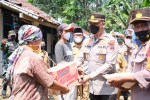 Kapolres Tegal AKBP Arie Prasetya Syafa’at, SIK bersama rombongan Polres Tegal turun langsung menyambangi lokasi kejadian sekaligus memberikan bantuan sembako kepada para warga yang terdampak bencana angin puting beliung, Senin (26/10/2021).