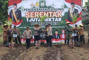 BREBES– Polres Brebes bersama sejumlah pihak menggelar program penanaman jagung 1 juta hektar serentak di Indonesia. Di Kabupaten Brebes, acara ini dilaksanakan di Desa Malahayu Kecamatan Banjarharjo dan Desa Tonjong Kecamatan Tonjong. Selasa (21/1/2025). Selain jagung, tanaman kelapa juga ditanam di lahan tidur atau lahan tidak produktif sebagai bagian dari upaya mendukung ketahanan pangan nasional.